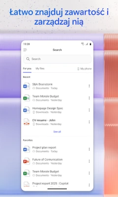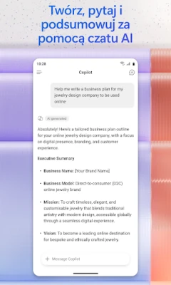 Przekształć swoje pomysły w oszałamiającą zawartość wizualną! Twórz i edytuj profesjonalne obrazy, plakaty, banery, angażujące filmy, ankiety i wiele więcej, korzystając z intuicyjnych szablonów dostępnych w **Microsoft 365 Copilot**. Potrzebujesz szybko zdigitalizować notatki czy dokumenty? Mobilna aplikacja umożliwia skanowanie plików prosto z telefonu. Uporządkuj swoje projekty, zbierając pomysły, dokumenty i linki w Notesach funkcji Copilot, a następnie poproś asystenta o inteligentne podsumowanie i powiązanie wszystkich elementów. Ciesz się elastycznym zarządzaniem plikami – bez trudu przesyłaj dokumenty Word, Excel czy PDF z pamięci telefonu, aby Copilot mógł Ci pomóc, a następnie zapisuj efekty jego pracy bezpośrednio na swoim urządzeniu. To kompleksowe rozwiązanie umożliwia wyszukiwanie, edytowanie, skanowanie i tworzenie treści w drodze, z dostępem do programów Word, Excel, PowerPoint oraz plików PDF w jednej, niezwykle wydajnej aplikacji od **Microsoft**. Aby rozpocząć korzystanie, wystarczy zalogować się za pomocą swojego konta Microsoft – służbowego, szkolnego lub osobistego.